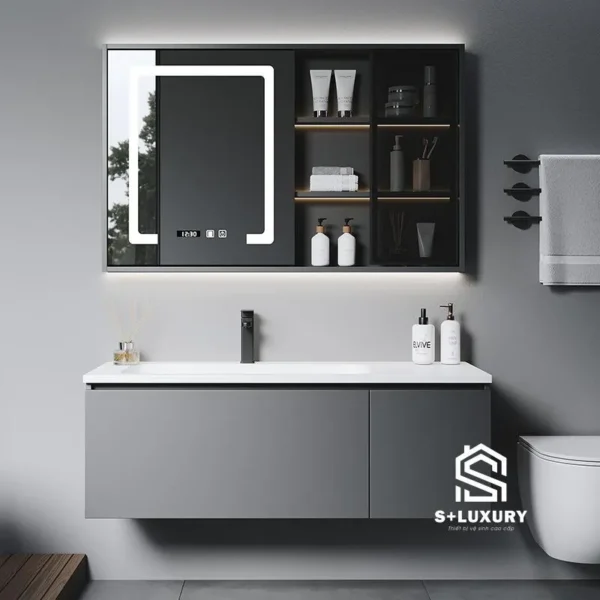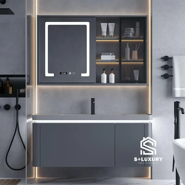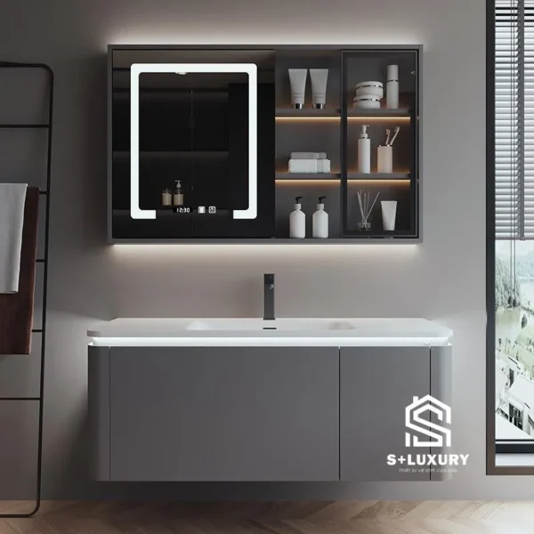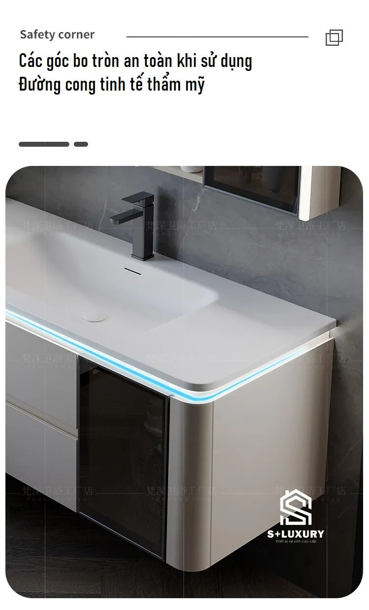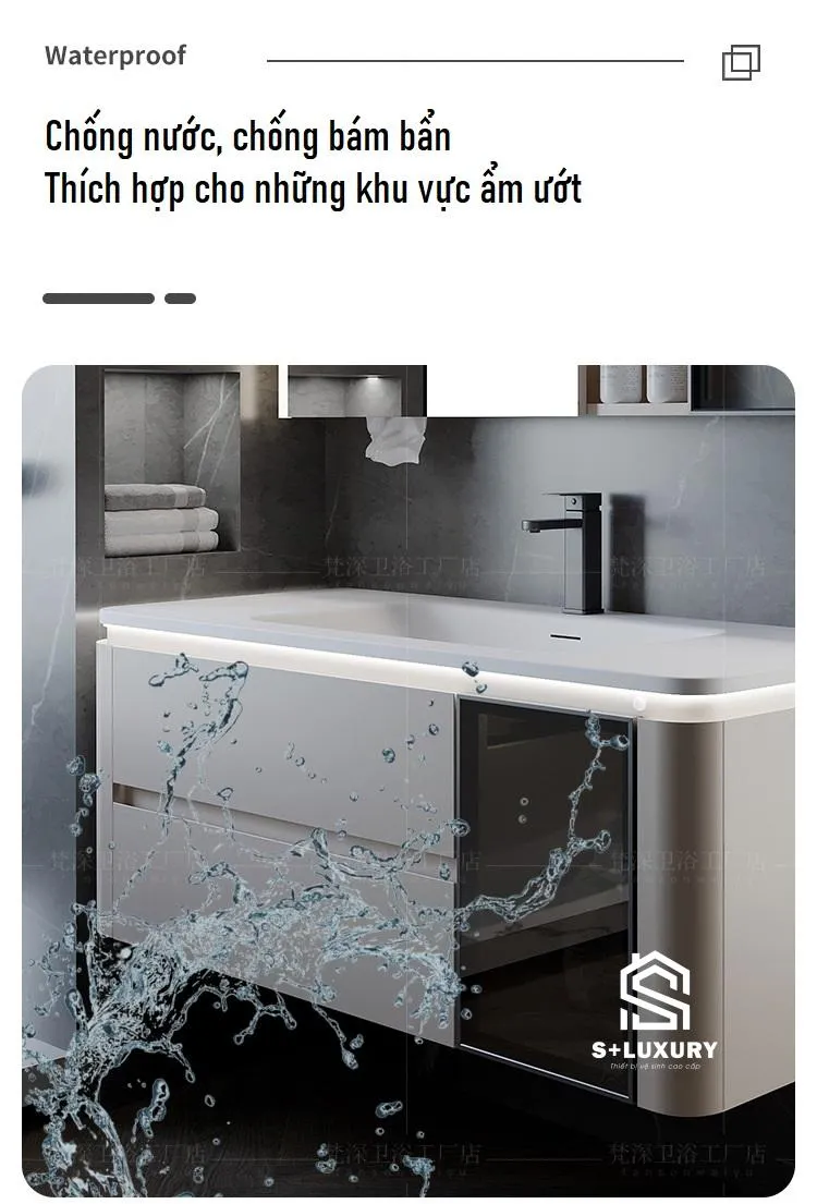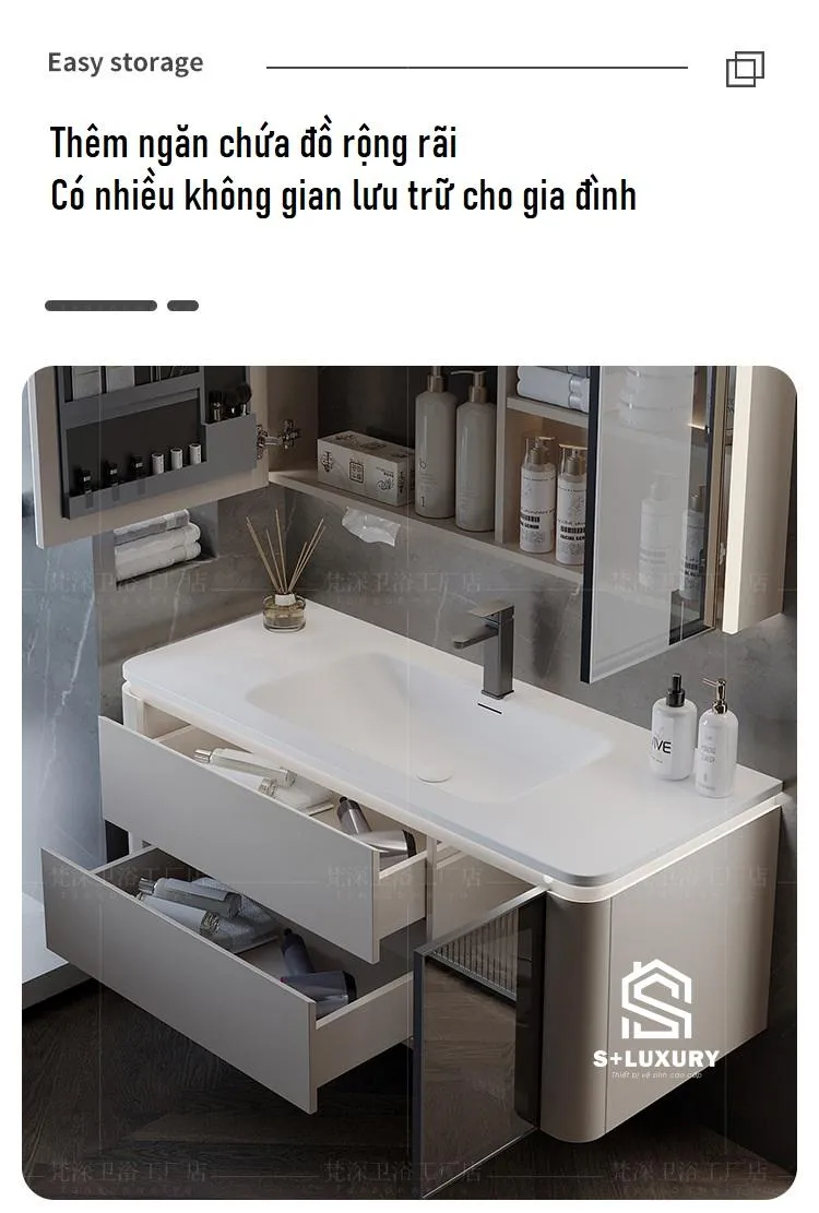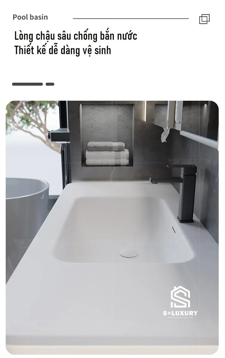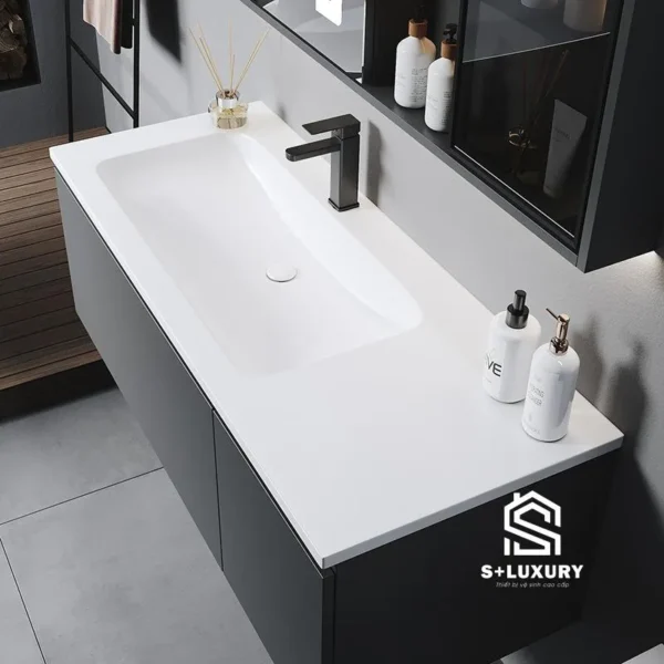 Tủ chậu lavabo liền khối cung cấp không chỉ một chậu rửa thuận tiện mà còn bề mặt bổ sung để bạn đặt đồ vật như xà phòng, kem đánh răng và các vật dụng nhỏ khác. Điều này giúp bạn duy trì không gian sạch sẽ và tiện dụng cho các hoạt động hàng ngày.