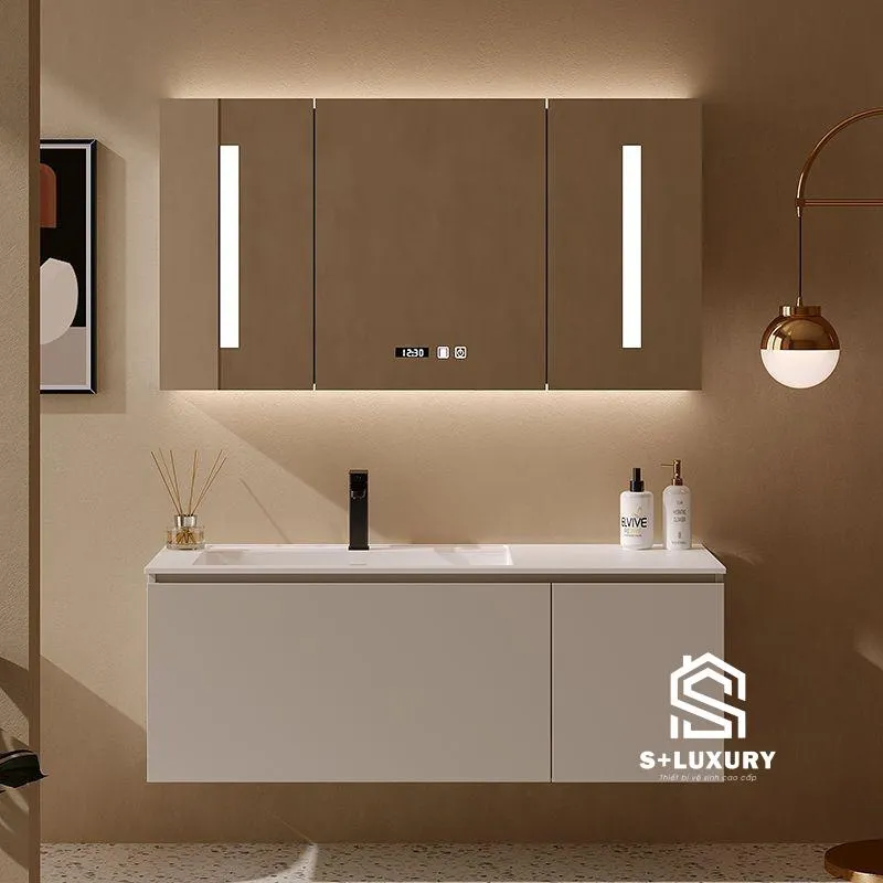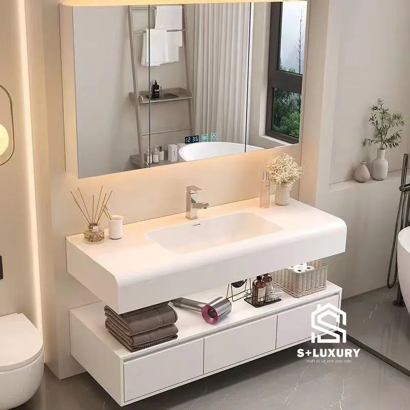 Tủ chậu lavabo treo tường: Thiết kế treo tường tạo sự thông thoáng cho phòng tắm và phù hợp cho không gian nhỏ.